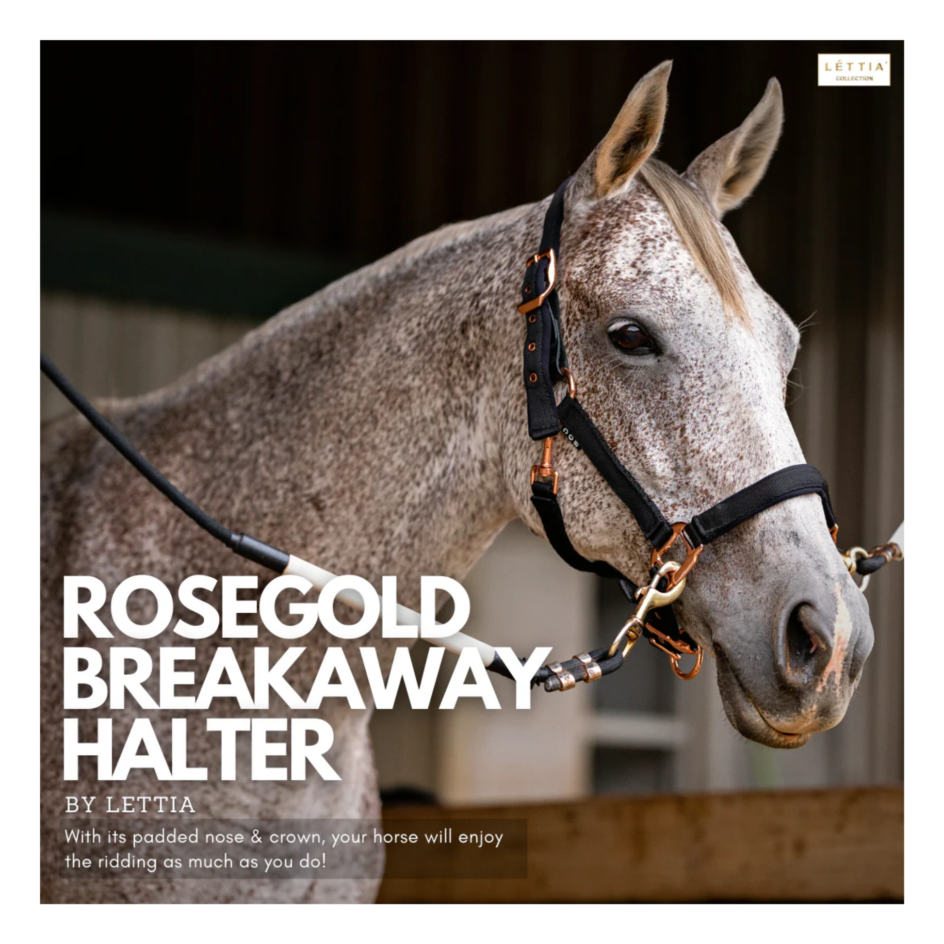 Introducing the Lettia Padded Leather Breakaway Halter with Rose Gold Hardware. This elegant and stylish halter features a vintage appeal with a padded nose for ultimate comfort. The reinforced rose gold hardware provides a flexible, yet classic fit. With a breakaway tab for high tension release, this lightweight halter is also buckle-free for added convenience. Experience the perfect combination of fashion and function with this high-quality halter.